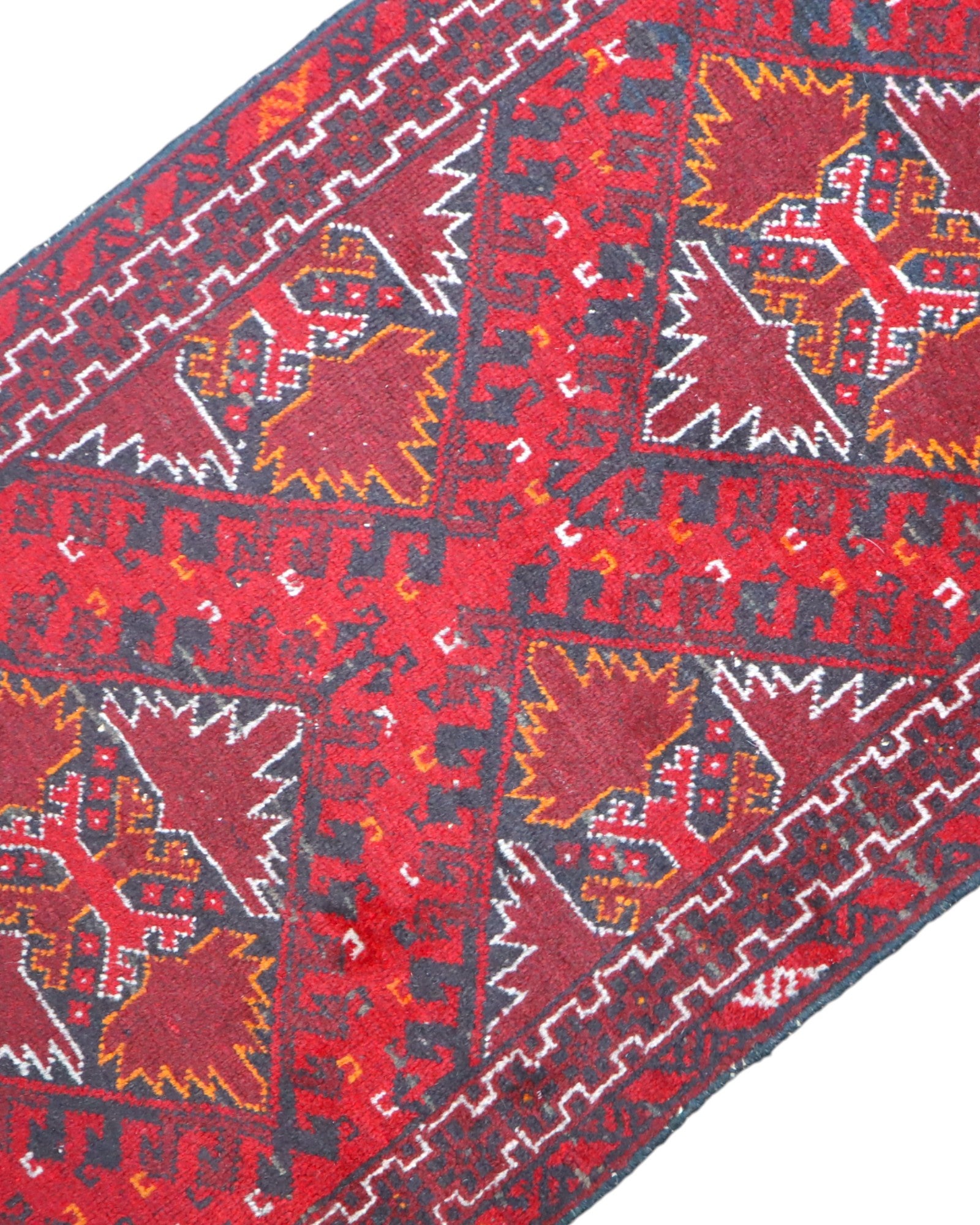 Il tappeto Turkman 267x76 cm è un corridore persiano tradizionale, caratterizzato da un fondo bordeaux intenso su cui si sviluppano motivi geometrici a losanga in rosso, nero e arancio. Il design ripetuto conferisce un ritmo visivo armonioso, tipico della produzione turkmena.