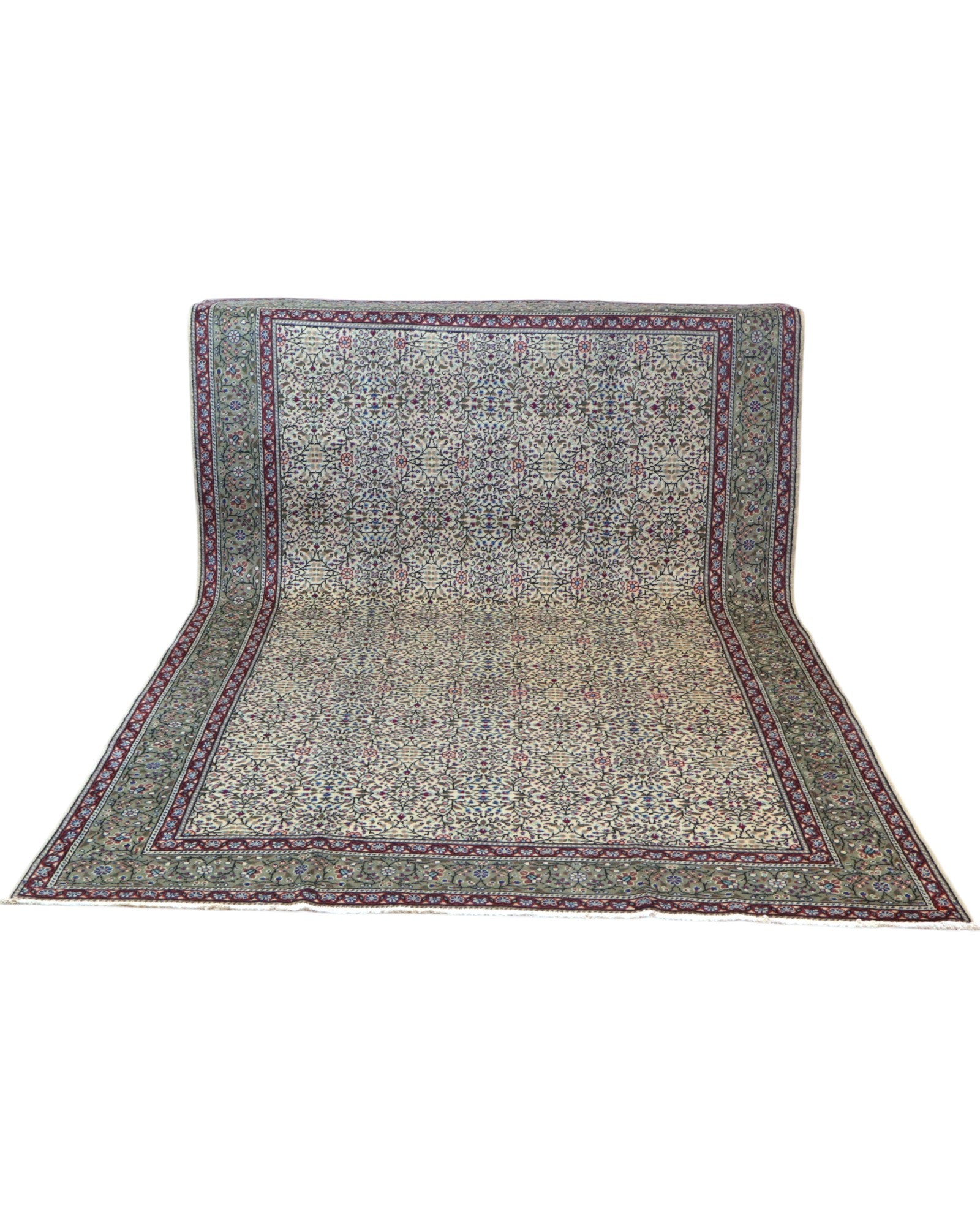 Il design si caratterizza per un fondo chiaro arricchito da motivi floreali e geometrici ripetuti, in tonalità delicate di rosa, blu e verde, incorniciati da bordure verdi e rosse. L’insieme armonioso e raffinato dona al tappeto un aspetto elegante e intramontabile.