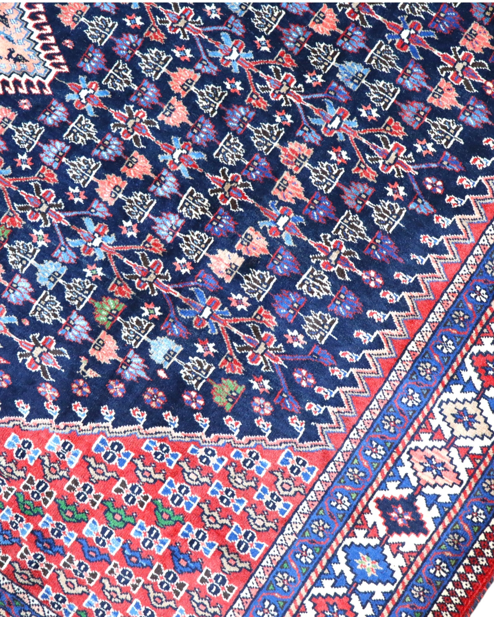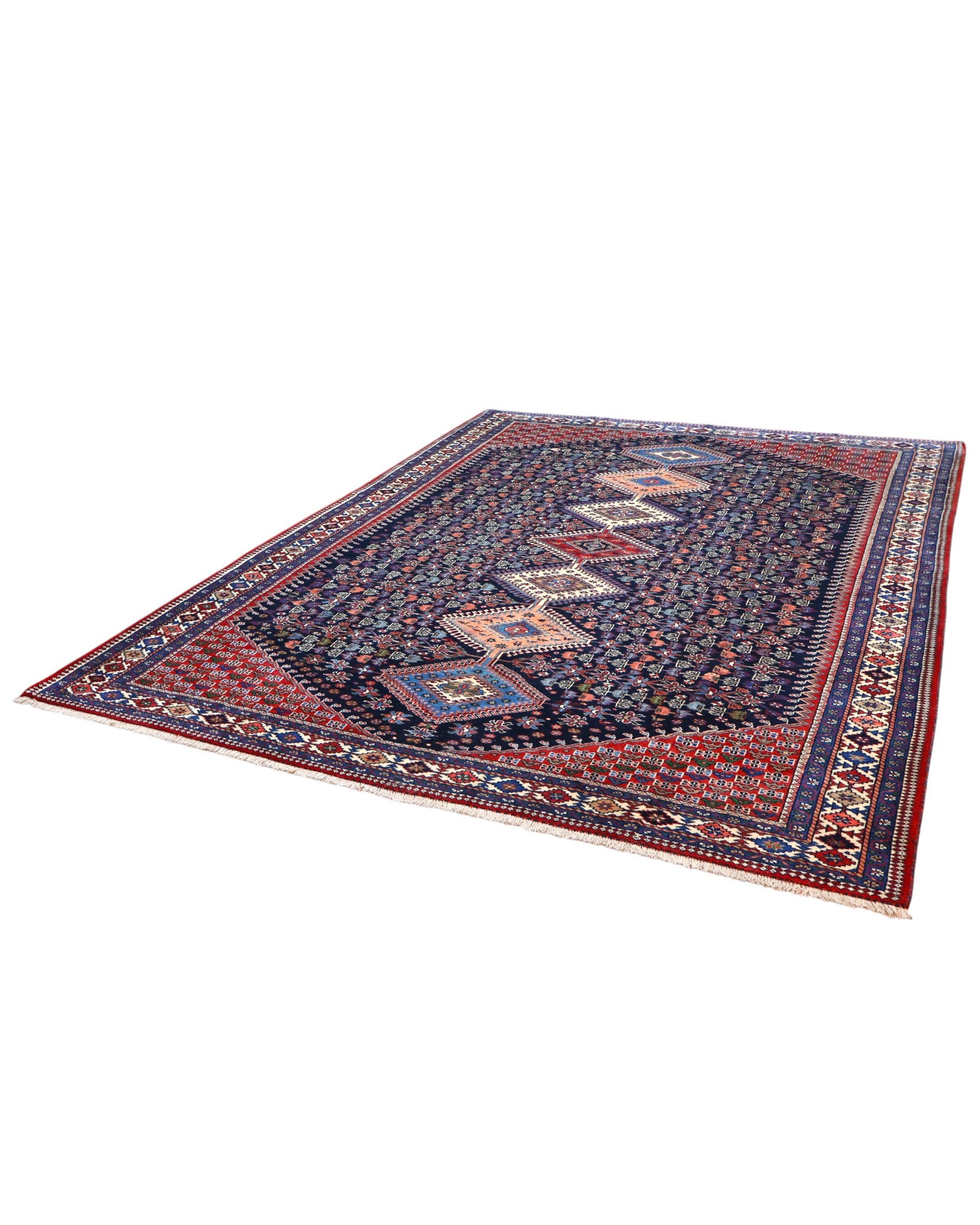 Questo tappeto Yalame è un autentico esempio di arte tessile persiana, apprezzato per la ricchezza delle sue geometrie e per la vivacità dei contrasti cromatici. È stato annodato a mano sul telaio tradizionale da esperti artigiani, realizzato con trama e ordito in cotone resistente e vello in lana tinta con colori vegetali. Le dimensioni di 346 x 265 cm lo rendono un tappeto ideale per grandi spazi, dove la sua presenza scenografica può valorizzare salotti o sale da pranzo. I motivi geometrici centrali, disposti in sequenza lungo l’asse del tappeto, esaltano la sua armonia compositiva. Un’opera di grande personalità che unisce tradizione e prestigio in un’unica creazione.