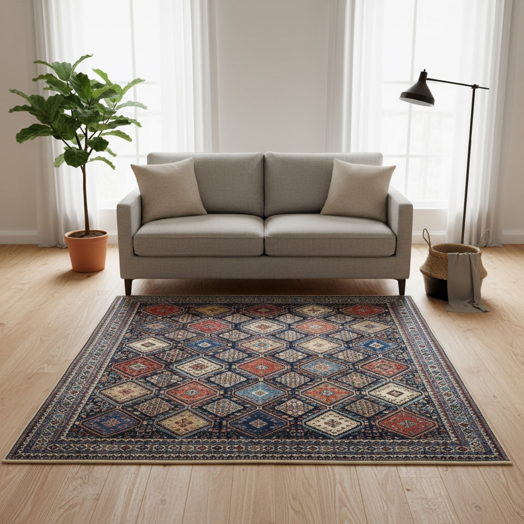 Il design si distingue per un fondo nel profondo colore blu, arricchito da motivi geometrici che si snodano con armonia su tutta la superficie. La combinazione di tonalità e la ricchezza dei dettagli conferiscono al tappeto un'eleganza intrinseca e una magnificenza che non passa inosservata.
