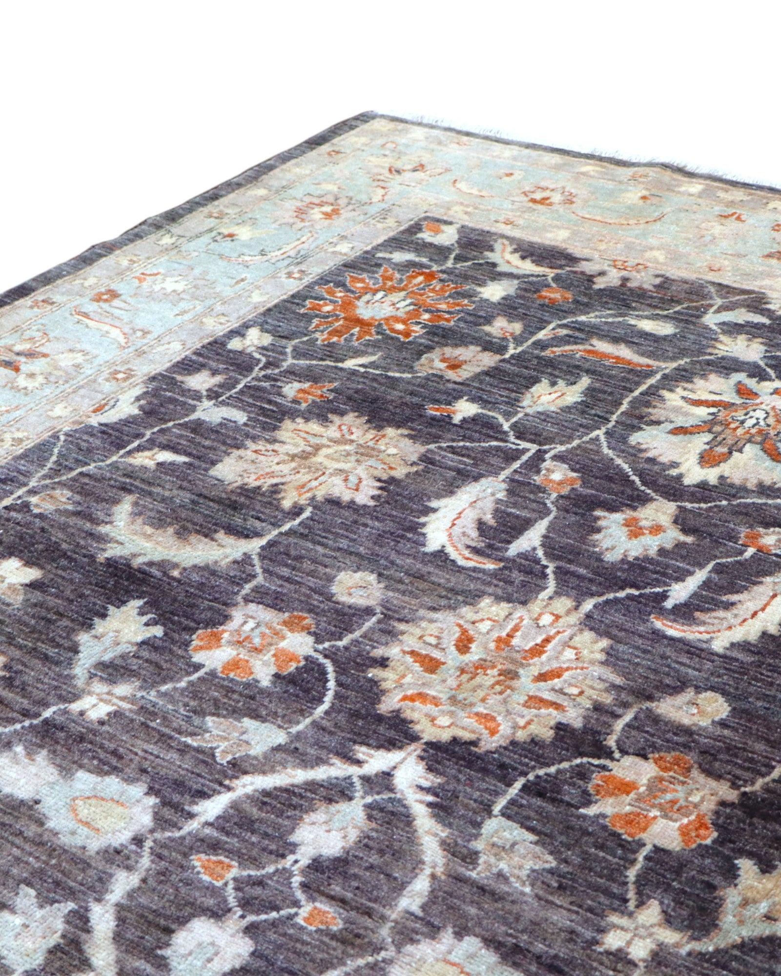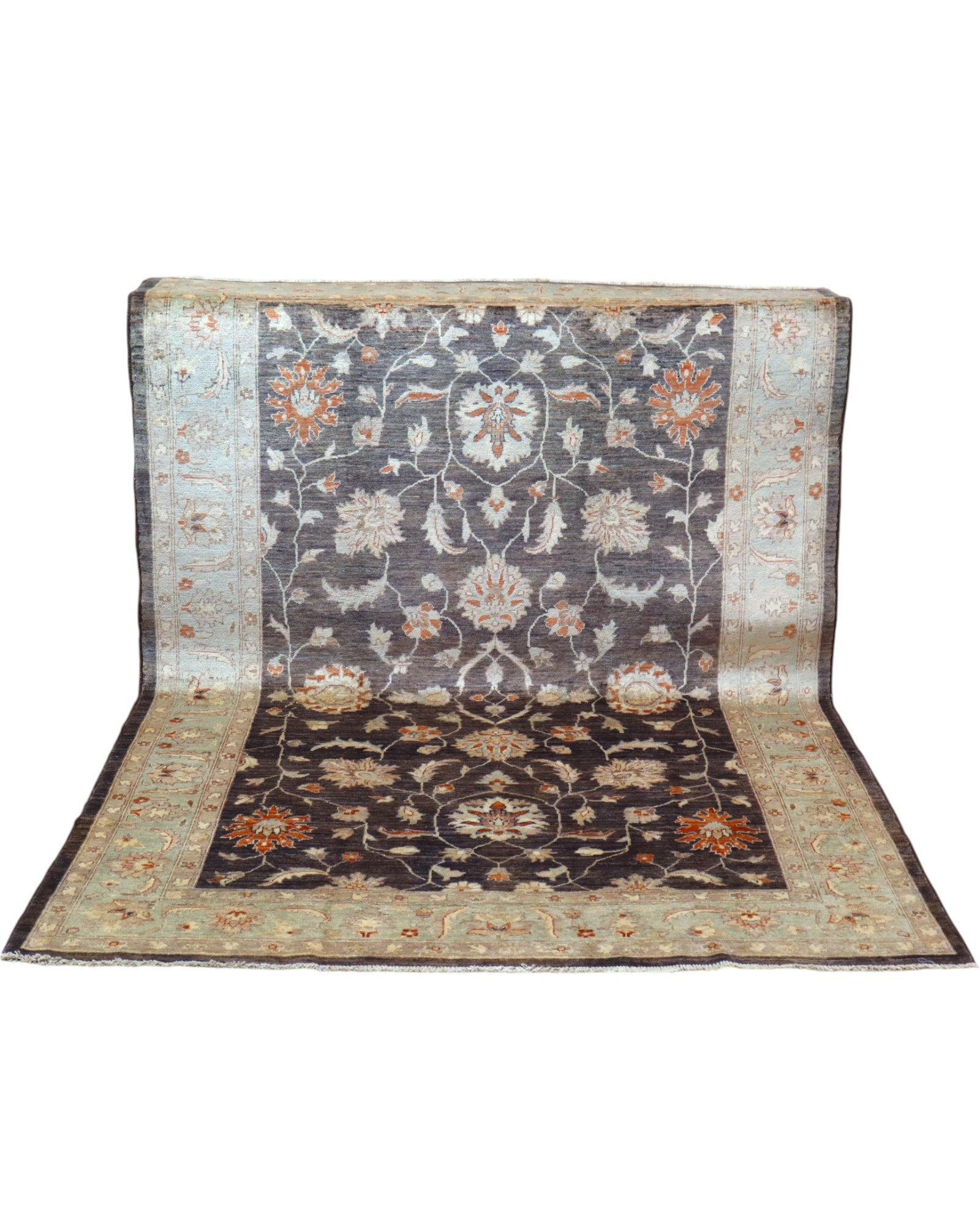 Questo magnifico tappeto Ziegler è un'espressione di pregio e abilità artigianale, annodato a mano su un telaio tradizionale da esperti artigiani. La sua solida struttura è costruita con una trama e un ordito in cotone resistente, mentre il vello in pura lana, tinto con colori vegetali, offre una superficie morbida e un'eccezionale vivacità cromatica.