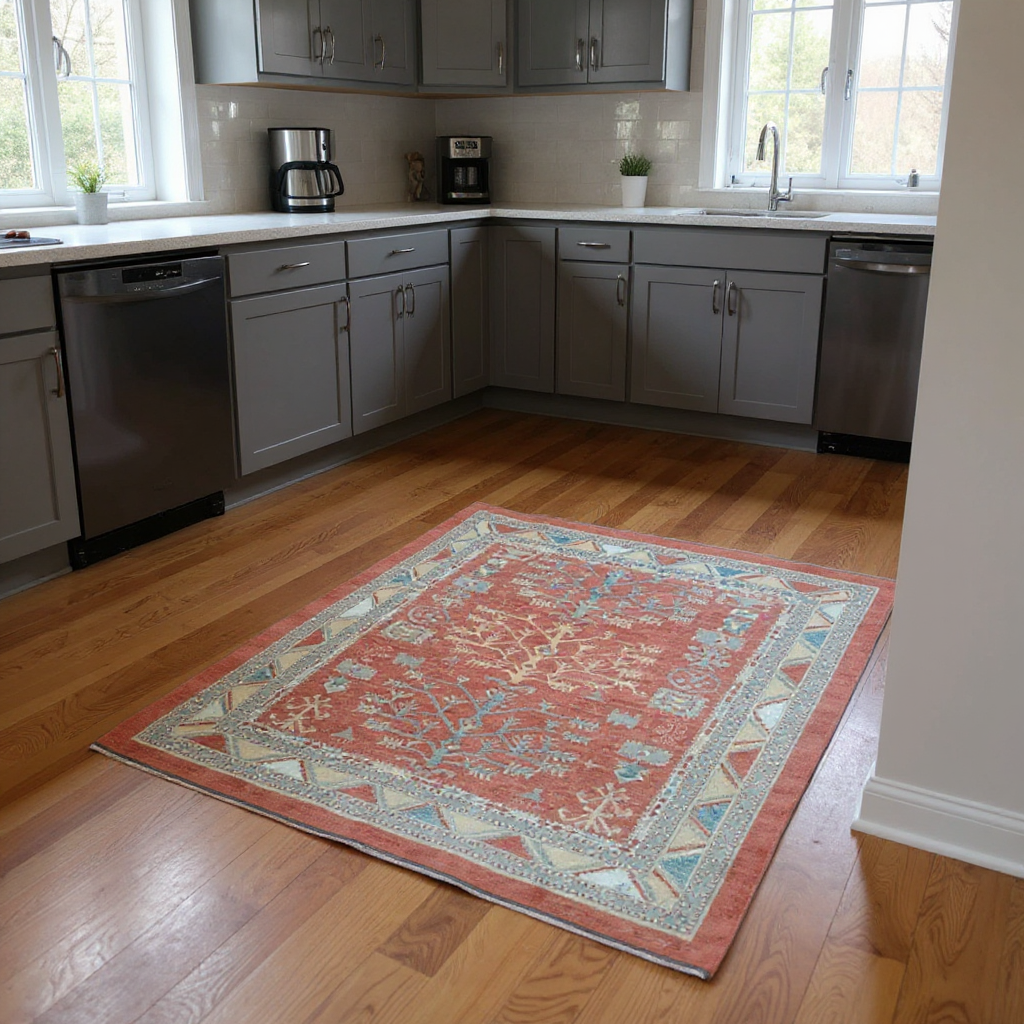 Il disegno si distingue per il raffinato motivo dell’Albero della Vita, rappresentato su un fondo rosso acceso e incorniciato da bordure geometriche in tonalità azzurre e avorio. L’equilibrio cromatico e la simbologia decorativa conferiscono al tappeto un fascino intramontabile.