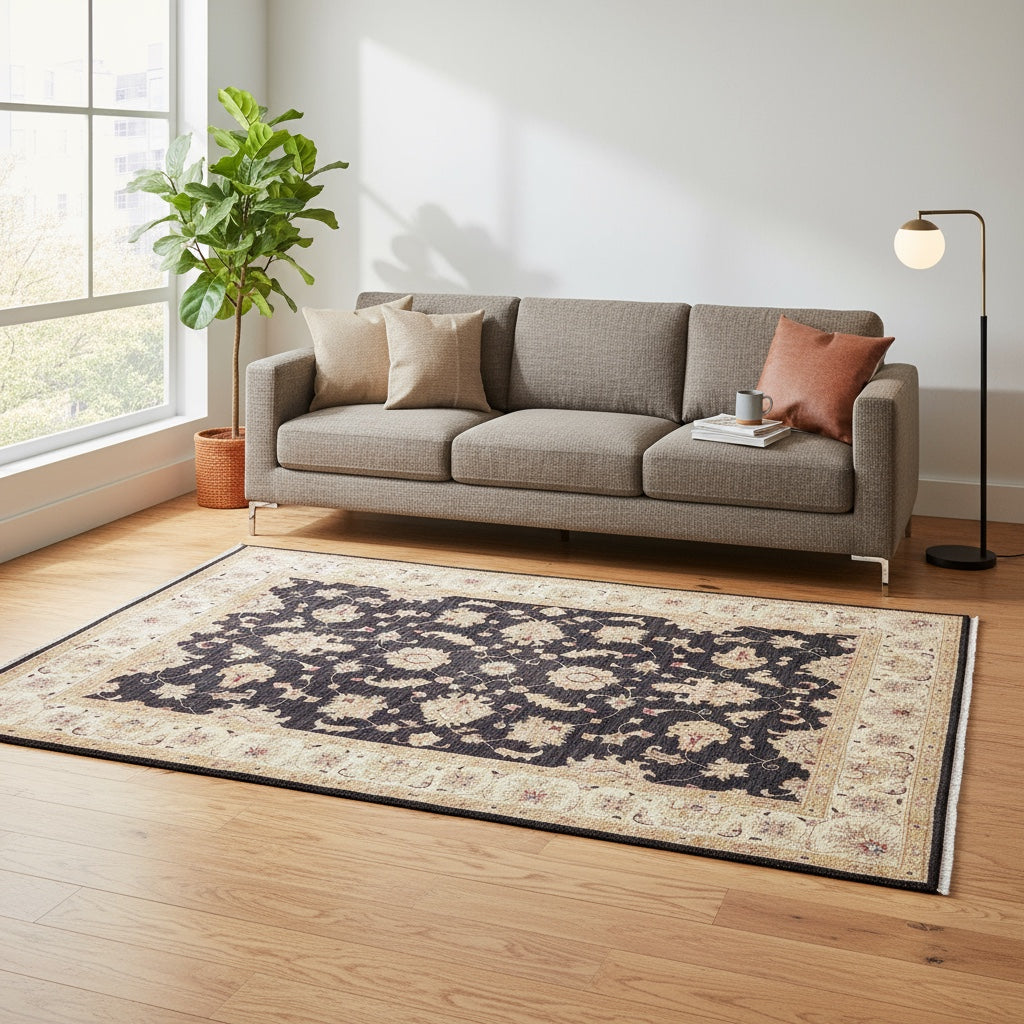 Il design si distingue per i suoi motivi contemporanei che si snodano con armonia su tutta la superficie. La combinazione di tonalità e la ricchezza dei dettagli conferiscono al tappeto un'eleganza intrinseca e una magnificenza che non passa inosservata.