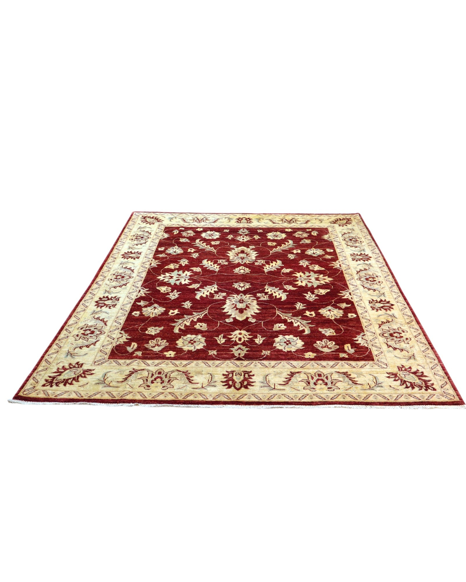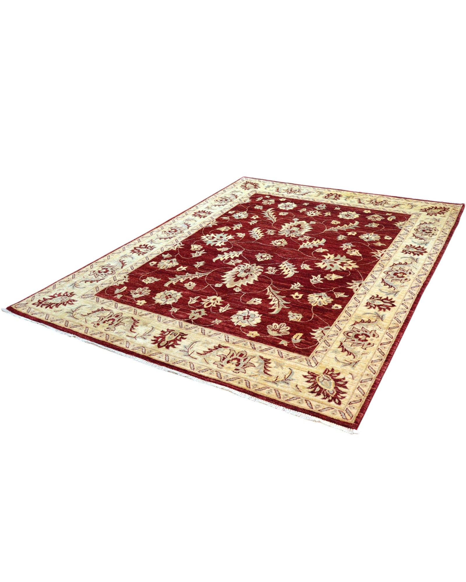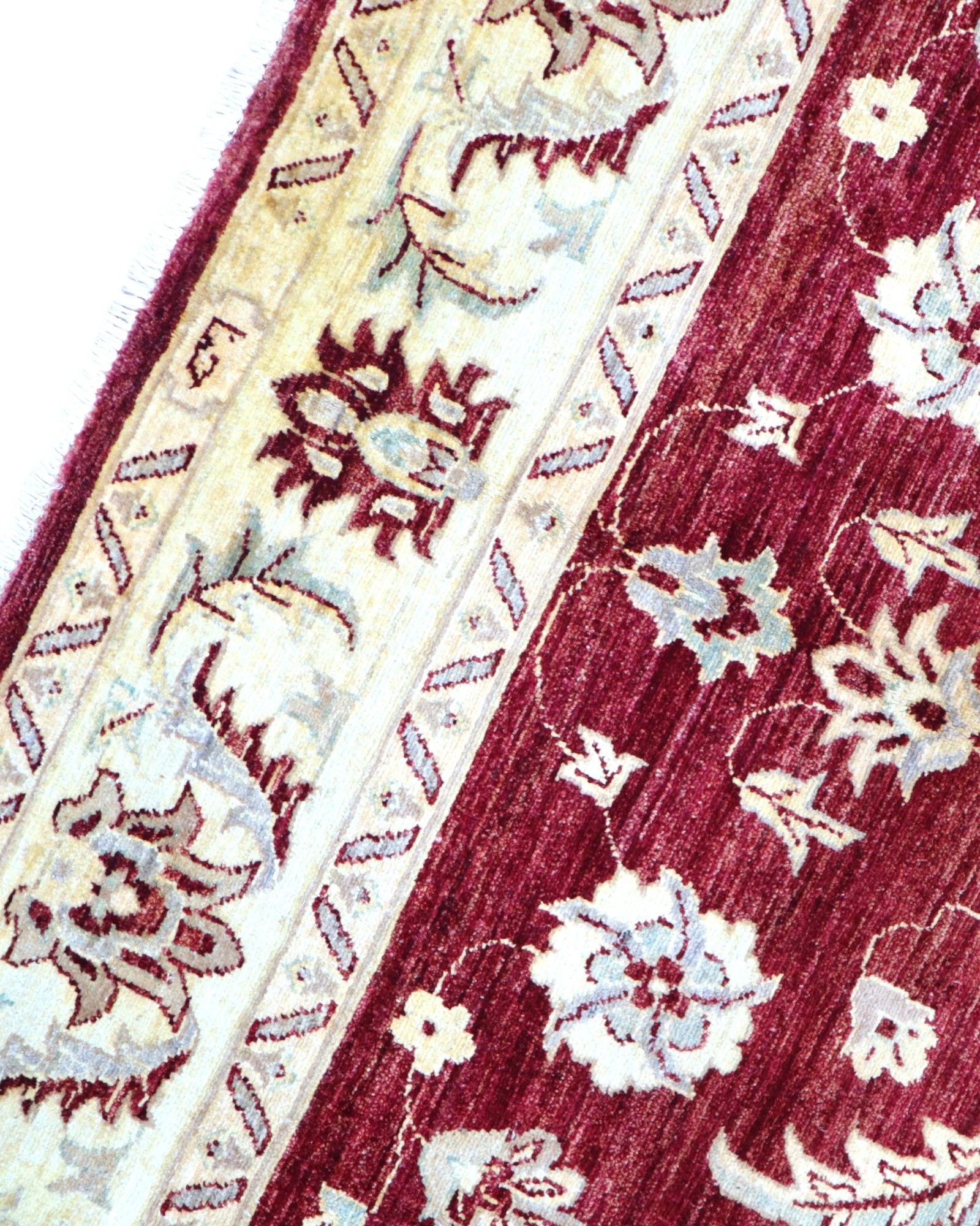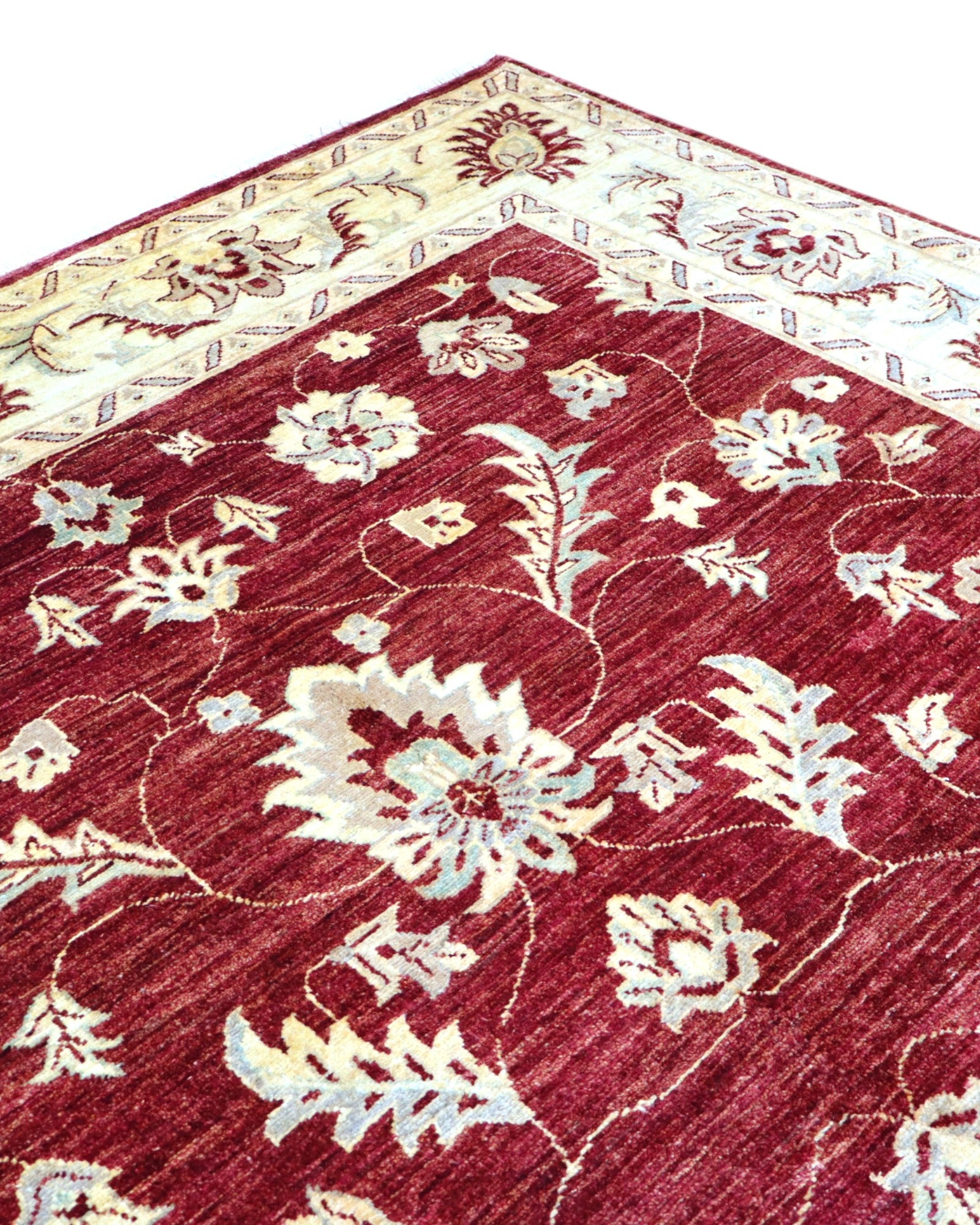 Il design presenta un campo color rosso melograno, adornato da motivi decorativi che si snodano con armonia su tutta la superficie. La cornice beige, con le sue volute eleganti e dettagliate, crea un contrasto raffinato e avvolge l'intero disegno in un'armonia visiva affascinante e accogliente. I colori vegetali donano al tappeto una profondità cromatica e una bellezza autentica che sapranno incantare nel tempo.