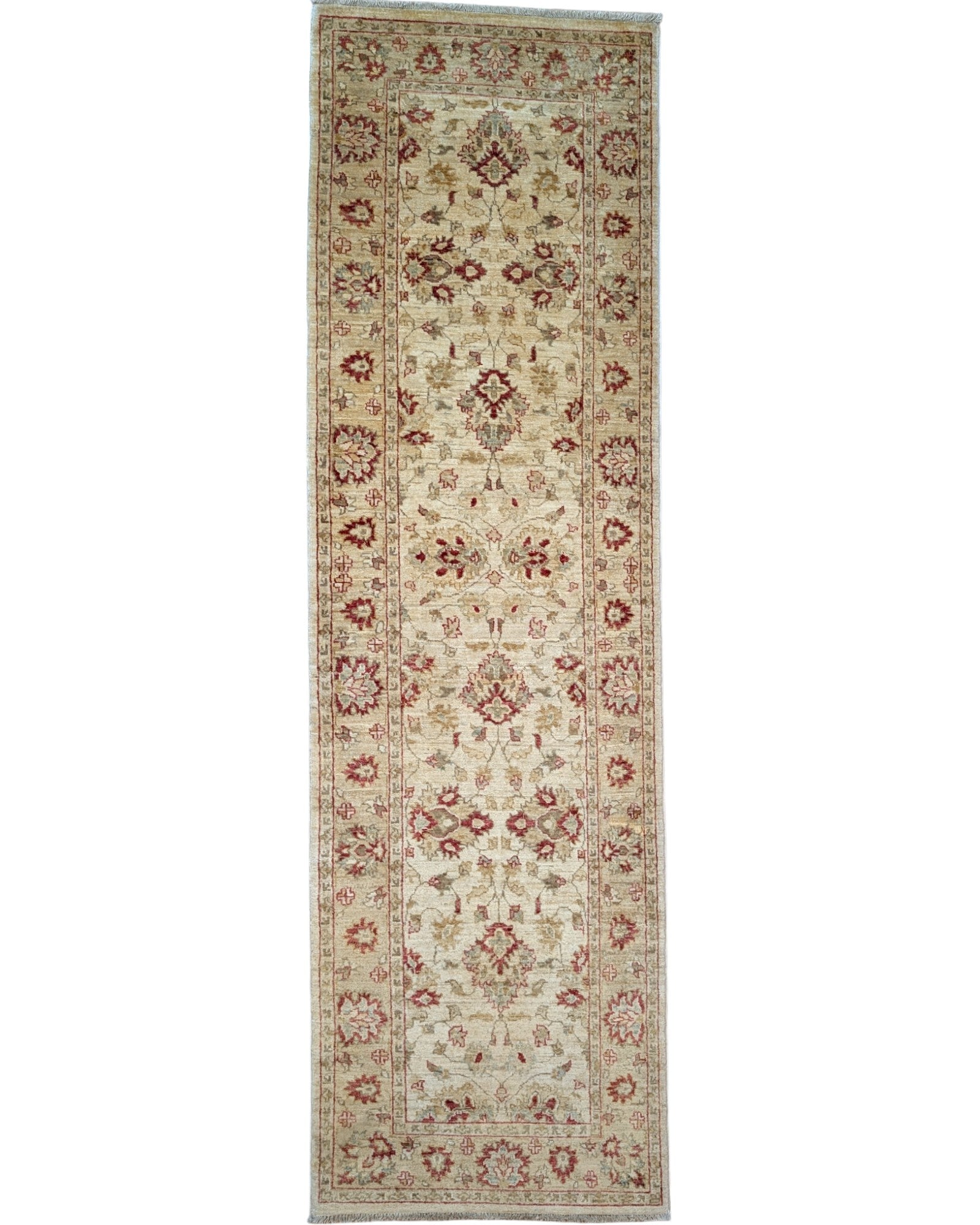 Questo tappeto Ziegler è un'autentica espressione di arte e maestria artigianale. Annodato a mano sul telaio tradizionale da esperti artigiani, con trama e ordito in cotone resistente e un vello in pura lana tinta con colori vegetali. Con le sue dimensioni di 290 x 84 cm, questo pezzo si rivela un esemplare di notevole bellezza e squisita fattura.