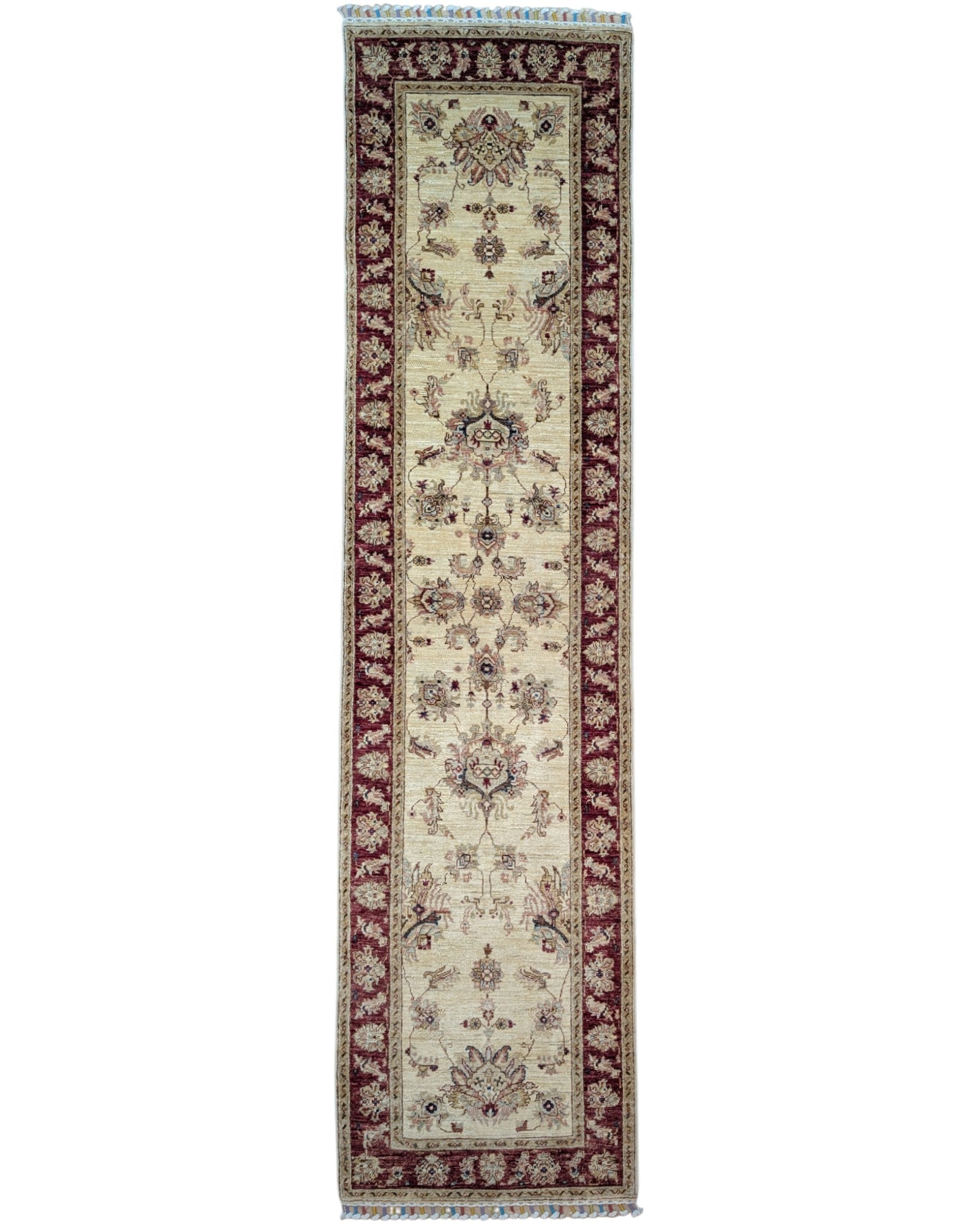 Questo tappeto Ziegler è un'autentica espressione di arte e maestria artigianale. Annodato a mano sul telaio tradizionale da esperti artigiani, con trama e ordito in cotone resistente e un vello in pura lana tinta con colori vegetali. Con le sue dimensioni di 320 x 80 cm, questo pezzo si rivela un esemplare di notevole bellezza e squisita fattura.